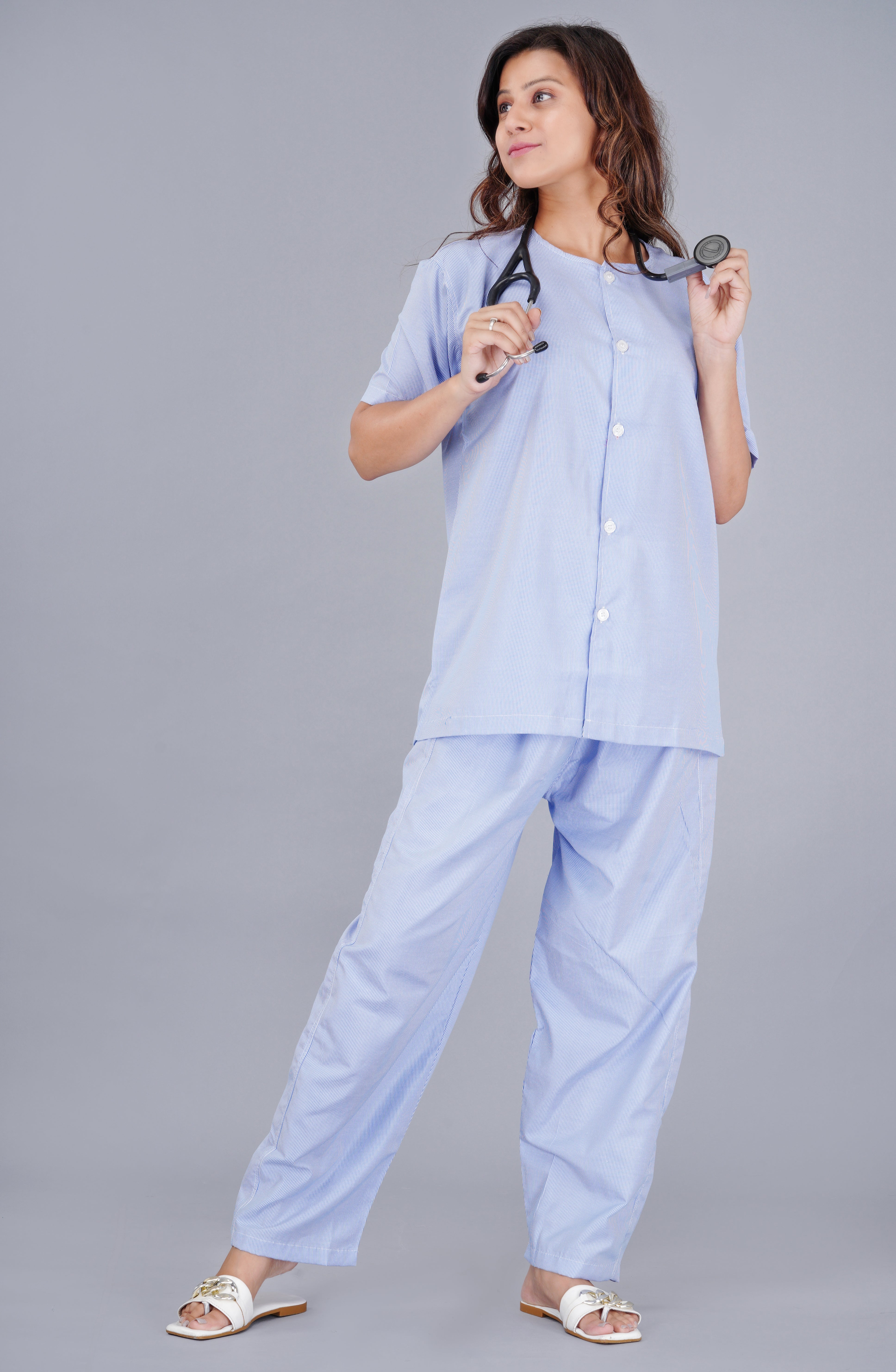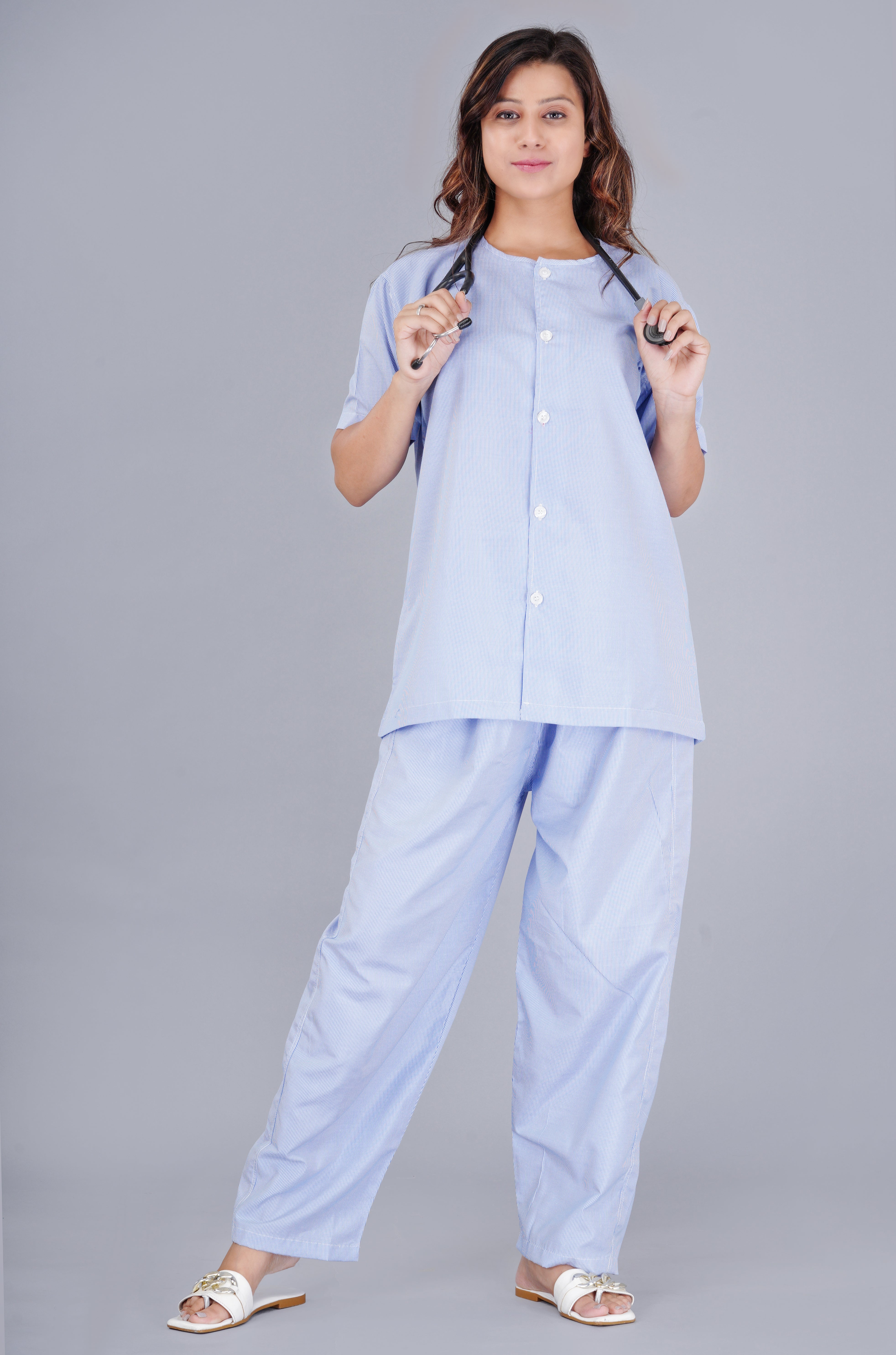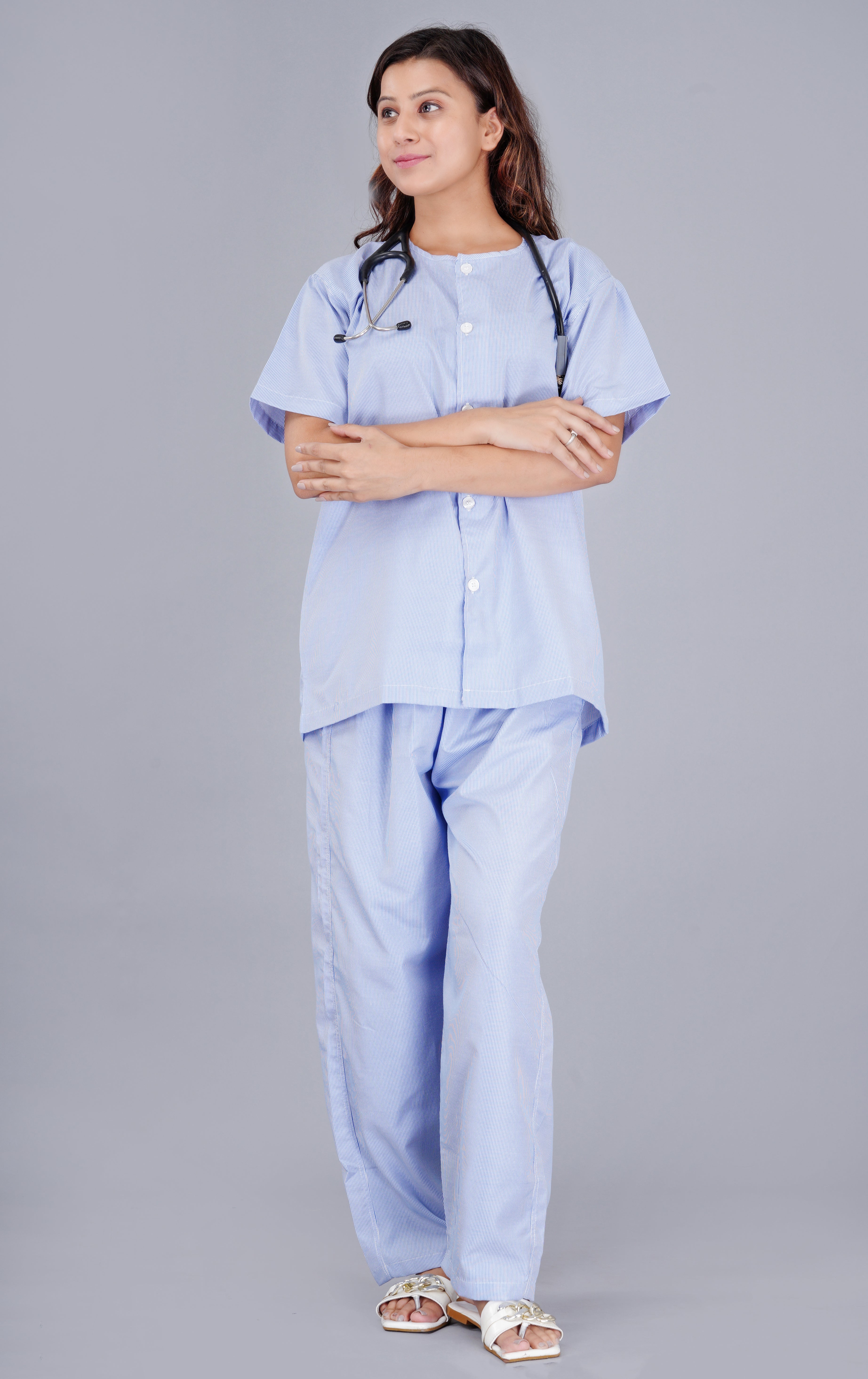 This Blue Lining RC Raymond cotton patient set for women offers a comfortable and breathable fabric ideal for sensitive skin. Crafted from high-quality cotton, it ensures softness and durability, making it suitable for extended wear during recovery. The set’s design prioritizes ease of movement and comfort, supporting patient needs with a professional touch. Perfect for hospital stays or home care, it combines practicality with trusted fabric quality.