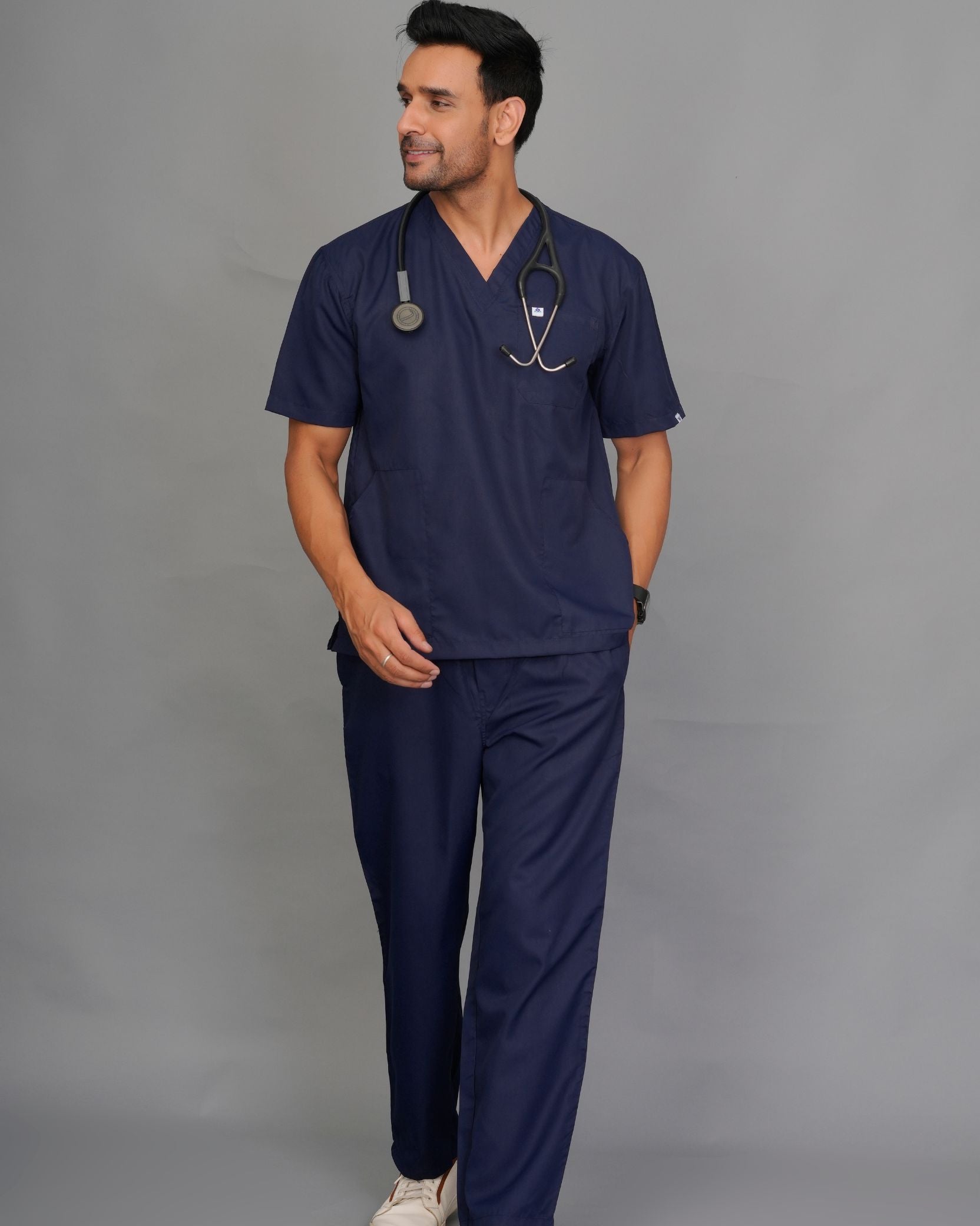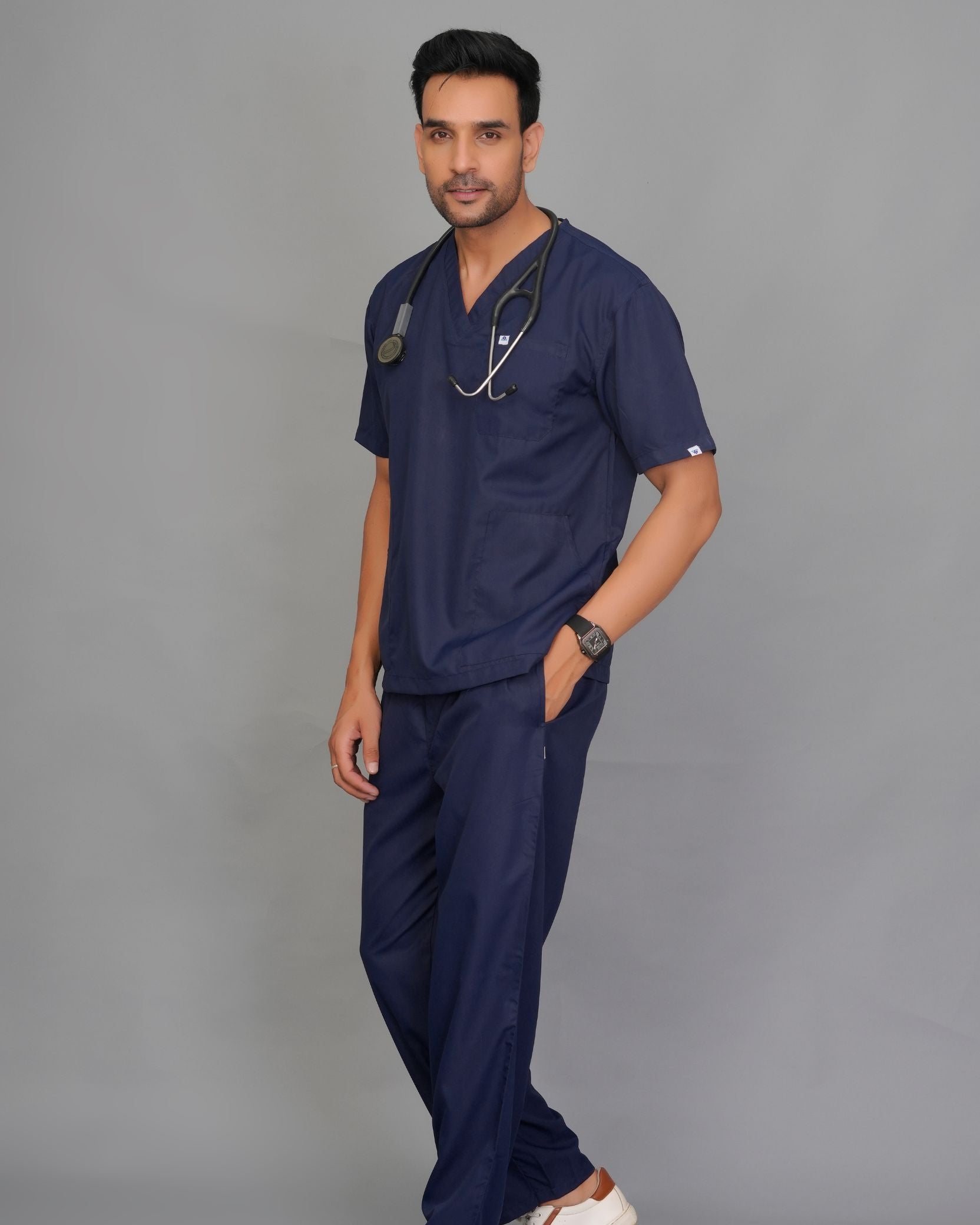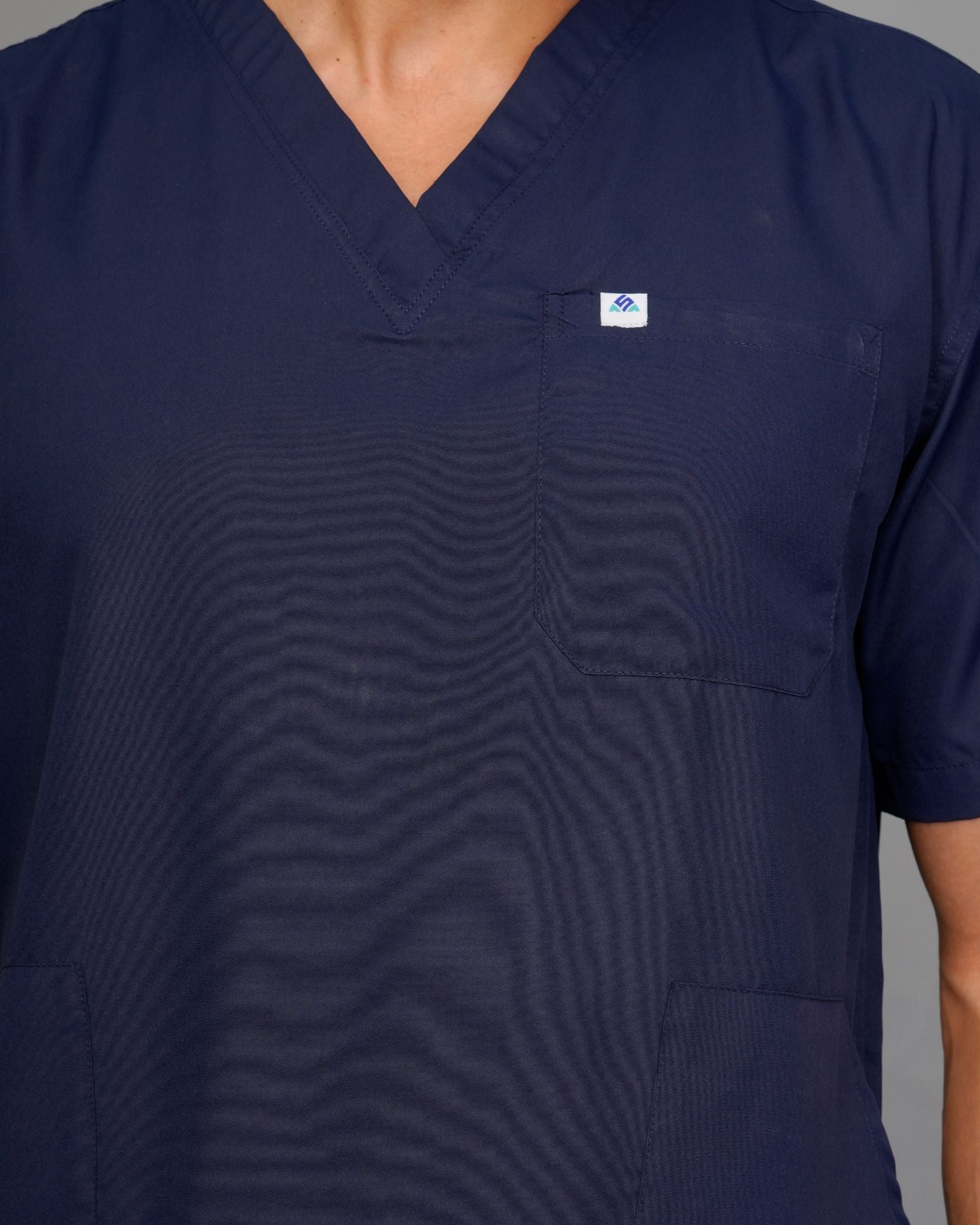 Designed for healthcare professionals, this Navy Blue Men's V-Neck Scrub combines functionality with comfort. The tailored V-neck design offers ease of movement during long shifts, while the durable fabric withstands repeated washing without fading. Features reinforced stitching at stress points and practical pockets for essential medical tools. Professional-grade quality meets workplace standards.